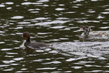 今年3度目の繁殖をしている足延池のカイツブリ<写真>は、1羽残った幼鳥をとても大事に育てており、お...
