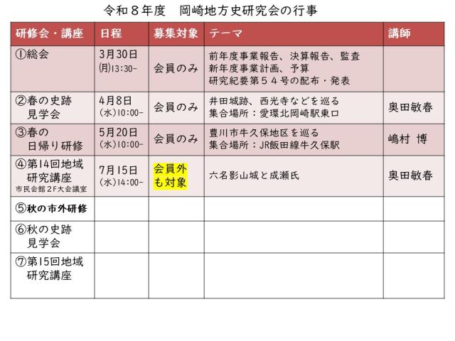 令和8年2月15日発行の岡崎地方史研究会便りで案内されています、新年度前半の行事を掲載します。 会員...